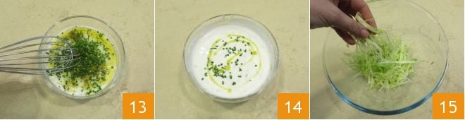 Also add the chives to the yogurt sauce 13 and blend the ingredients well with a hand whisk until you get a homogeneous sauce 14. You now have all the ingredients to prepare the salad. Take a large bowl or salad bowl. Place the iceberg lettuce 15,