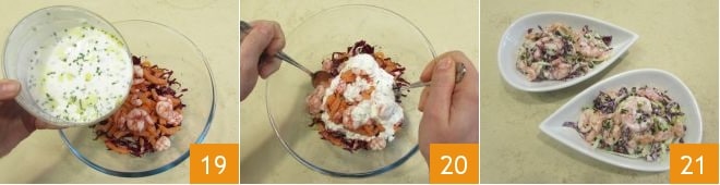 Then pour the yogurt sauce over it 19 and use a spoon to mix the ingredients well 20 to ensure the sauce combines with the fish and vegetables. Your yogurt salad with salmon and shrimp is now ready to refresh your and your guests' palates 21!