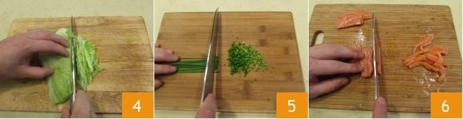 Then cut it into thin strips 4. Set it aside in a small bowl. Proceed by finely chopping the chives 5, also placing it in a small bowl. Then move on to preparing the salmon. Cut it into thin slices and then each of them into small strips 6.