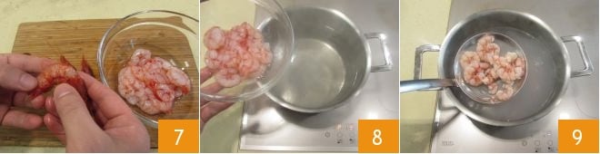 Finish preparing the seafood by cleaning the How to clean shrimp: remove the head and shell 7, then gently extract the intestine with the help of a toothpick. Take a pan, fill it with water, and bring it to a boil. Boil the shrimps for 1 minute 8, then use a slotted spoon to remove them from the pan and place them in a small bowl to cool.