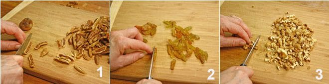Start the preparation of the zelten by preparing the dried fruit: cut the figs into strips 1, halve the Malaga grapes 2, and coarsely chop some of the walnuts 3.
