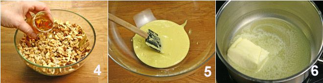 Put the chopped fruit in a bowl and add the raisins, some pine nuts, hazelnuts, and the rum 4. Let it macerate for about an hour. Meanwhile, separate the egg yolks from the egg whites, and beat the yolks with half of the sugar until they become light and fluffy 5 and melt the butter in a saucepan 6.