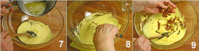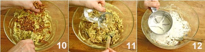 Then add the melted butter to the eggs, and mix well 8. Then add the dried fruit to the mixture, stirring continuously 9.