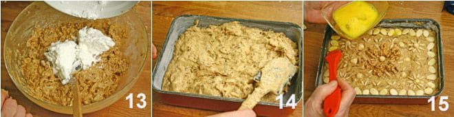Separately, beat the egg whites with the other half of the sugar until stiff and fold them into the batter 13. Take a rectangular baking pan (8x10 inches), butter and flour it, pour the mixture into it, and spread it well using a spatula 14. Before baking, decorate the zelten with almonds, pine nuts, walnuts, and hazelnuts.