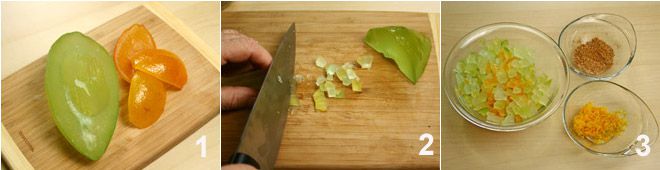 The first thing to do in making zelten is to prepare the dried and candied fruits, the main ingredients of this recipe. Take the candied fruit and cut it into cubes (1-2). Then place the grated lemon and orange peels, nutmeg, and cinnamon in small bowls 3.