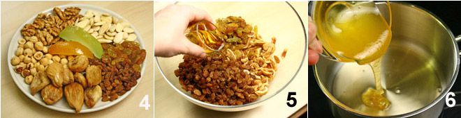Next, take care of the dried fruit 4. Put the raisins, halved Malaga grapes, and dried figs with the hard stems removed and cut into strips in a large bowl 5. Add two small glasses of rum to the dried fruit, mix well and let the fruit fully absorb the liquid 5. Meanwhile, warm and melt 2.5 oz of honey with the wine in a saucepan 6.