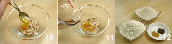 Meanwhile, crumble the yeast cube in a small bowl and add a teaspoon of honey 10, cover with warm water 10, mix, and wait for foam to form on the surface. Meanwhile, prepare the rye and wheat flour 12.