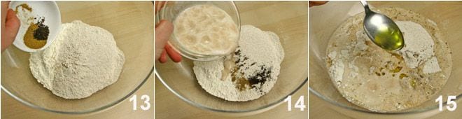 In a bowl, combine the two types of flour with caraway and anise 13, then add the yeast mixture 14 and the tablespoon of oil 15.