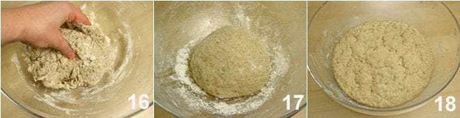Knead everything until you obtain a compact, soft but not sticky dough 17 and let it rise in a flour-dusted bowl until it doubles in volume 18.