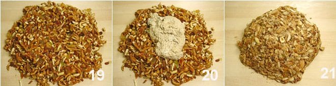 Take the bowl with the dried fruit and pour the contents onto a work surface 19, place the dough on top 20 and knead everything well until you get a homogeneous dough that does not crumble 21.
