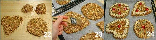 Divide the dough into eight equally sized pieces 22 and shape them as you prefer, (round, heart-shaped, rectangular, oval, square) as long as the zelten are about 3/4 inch thick. Brush the zelten with sugar syrup or rather fluid honey (melt it over the fire) 23. Let them rest and dry for 30 minutes, then decorate them as you like with dried and candied fruit 24. Brush the zelten again with sugar and bake at 300/320 degrees Fahrenheit for 40 minutes. Remove from the oven and let your zelten cool, then wrap them in plastic wrap and let them rest for 10-15 days in a dry place before consuming.