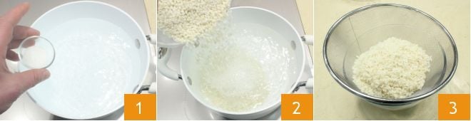 To make the rice fritters, first place a high-sided pot with plenty of water on the fire, salt the water 1, add the rice 2, and cook it for about 20 minutes. When the rice is cooked, drain it and let it cool 3.