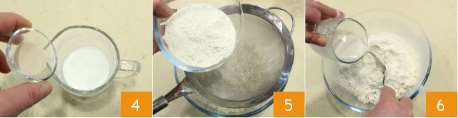 Meanwhile, dissolve the dry yeast in the milk 4, sift the flour into the bowl with the now cold rice 5, pour the milk in which you dissolved the yeast 6, and mix with a fork to combine the mixture,