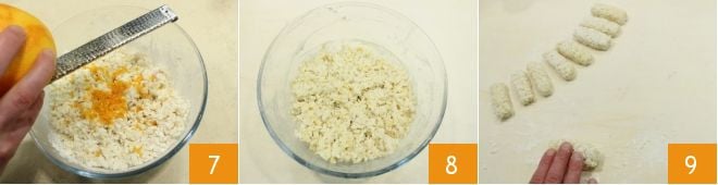 flavor with grated orange zest 7, mix well with a spoon. Let the dough rest for about half an hour 8, then roll it out on a lightly floured surface and form well-tapered sticks about 4 inches long 9.