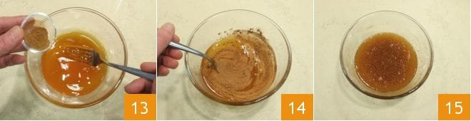 In the meantime, prepare the accompanying sauce: squeeze the juice of two oranges (about 2.2 oz) 10. Pass the juice through a strainer 11 and add it to the honey 12
