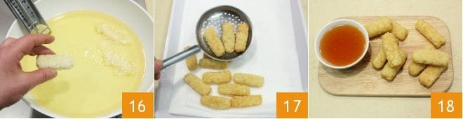 Now proceed with frying: heat vegetable oil in a pan, and when it is hot (around 338°F), plunge the rice fritters 16. Once the fritters are golden on all sides, remove them from the pan and drain excess oil on a sheet of paper towel 17. Your rice fritters are ready to be enjoyed with the delicious honey and orange sauce 18.