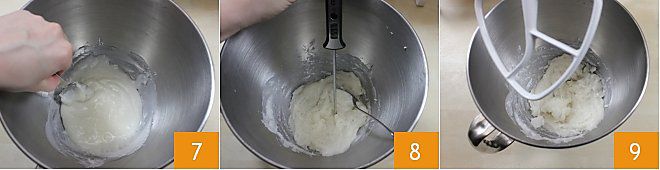 and stir it with a spoon, cooling it down to a temperature of 140 degrees Fahrenheit (7-8). At this point, work it in the stand mixer equipped with a paddle attachment until you obtain a white and compact block 9.