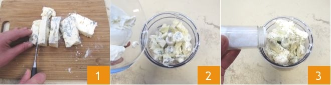 To prepare the zucchini caviar with gorgonzola cream, start by coarsely cutting the gorgonzola 1. Transfer it to a blender with the cream cheese 2 and season with salt 3 and pepper.