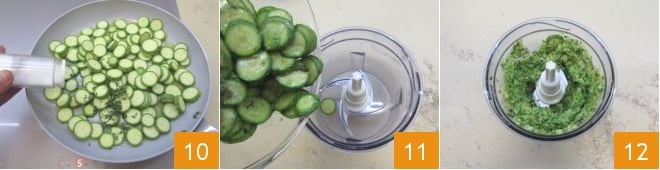 Season with salt 10 and pepper and continue to cook gently for at least 10 minutes. Then turn off the heat and let it cool. Then transfer the cooked zucchini to the blender 11 and blend them coarsely 12.