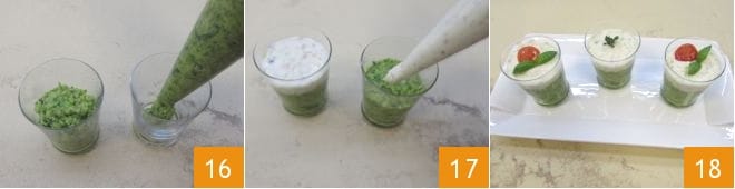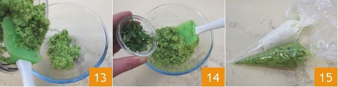 Transfer the zucchini caviar obtained in this way into a bowl 13 and fragrance it with basil 14. At this point, place the gorgonzola cream and the zucchini caviar separately in 2 piping bags 15.