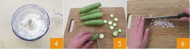 Blend until you obtain a smooth and homogeneous cream 4, then proceed with preparing the caviar: cut the zucchini into thin slices 5 and chop the shallot 6.