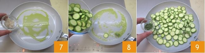 In a non-stick pan, heat the oil and add the shallot 7. Let it gently stew for 5 minutes, then add the zucchini 8 and thyme 9.