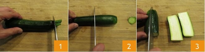 To prepare zucchini in carpione, wash and trim the zucchini 1, then cut them in half lengthwise 2, and then again in half lengthwise 3