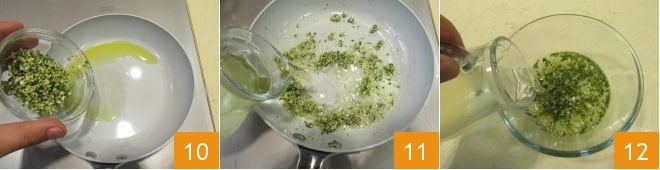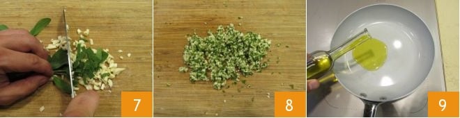 Add the sage leaves and finely chop them as well 7 to obtain an even mince 8. Pour the olive oil into a pan 9 and heat it