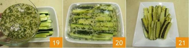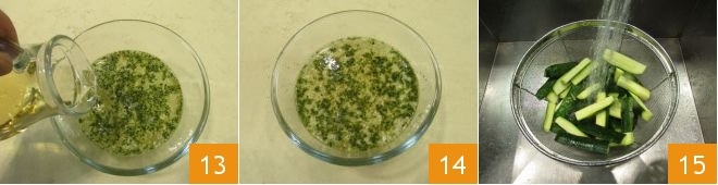 and the white wine vinegar 13; mix and set the marinade aside 14. After 30 minutes of draining the zucchini, rinse them under running water 15.