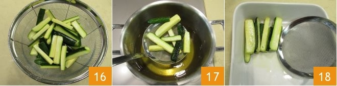 Then let the zucchini drain in a colander for about 10 minutes 16. Heat the peanut oil for frying in a deep pan (the oil should not exceed 338–356°F, to be measured with a kitchen thermometer). Once the zucchini are well-drained, fry them a few at a time 17: it will take about 4 minutes. As the zucchini are cooked, drain them with a slotted spoon directly into a small deep dish about 4x6 inches 18.