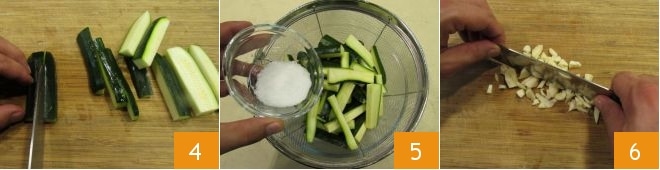 From each portion, cut 3 sticks of the same size 4. Place the zucchini sticks in a colander positioned over a bowl, then salt them 5 and let them drain for about 30 minutes, which is the time needed for the zucchini to release their water content. In the meantime, peel and finely chop the garlic cloves 6