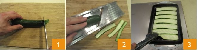 To prepare zucchini rolls with prosciutto and robiola, first wash the zucchini. Then trim them on both sides 1 and using a mandoline or a knife, cut 12 slices 0.08-0.12 inches thick 2. Grease a grill and heat it; then place the zucchini slices 3 and cook for about 5 minutes.