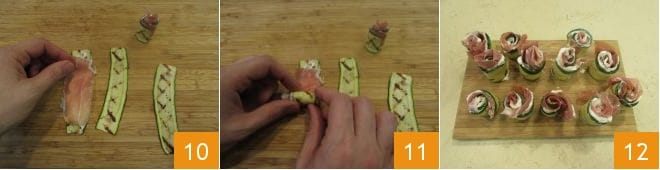 Add a slice of prosciutto 10, roll up 11, and serve your zucchini rolls with prosciutto and robiola 12.