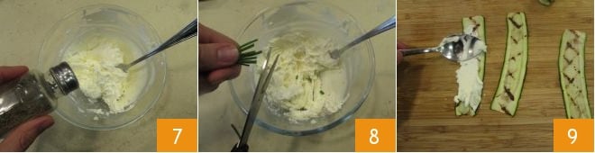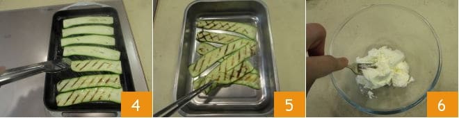 Then turn them over and continue cooking on the other side 4. Transfer the grilled zucchini to a platter 5 and set them aside for a moment. Transfer the robiola to a bowl and mash it slightly with a fork 6.