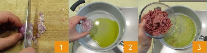 To prepare the zucchini rolls, first clean the shallot and finely chop it 1, then place it in a pot with a bit of olive oil 2 and let it stew over low heat for 2 minutes. When the mixture is soft and translucent, add the ground beef 3 and brown it for a few minutes