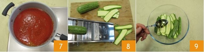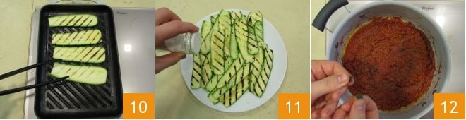Heat a grill, place the zucchini slices on it, and cook for 1 minute on each side 10. As they are cooked, place them on a plate and salt them 11. Meanwhile, the ragù will be done; perfume it with marjoram leaves 12, finally adjust the salt and pepper.