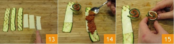 Now you can assemble the rolls: cut the cheese into slices the same width as your zucchini 13, then stuff the zucchini with a slice of cheese and a teaspoon of ragù 14. Finally, roll up the zucchinis 15.