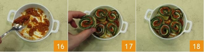 Take small individual baking dishes and spread the ragù on the bottom 16, then place the rolls inside 17 and grill them at 464°F for about 8 minutes, just enough time for the cheese to melt. Serve your zucchini rolls while still warm 18.