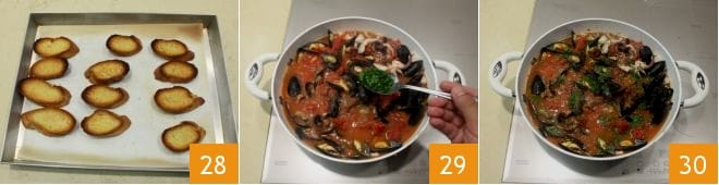 Place under the grill for 4-5 minutes, and when the croutons are golden and crispy 28, remove them from the oven. Just before finishing cooking, add the freshly chopped parsley sprig 29: your Neapolitan mussel soup is ready 30; just serve it, accompanied by the crispy and tasty croutons you've prepared.