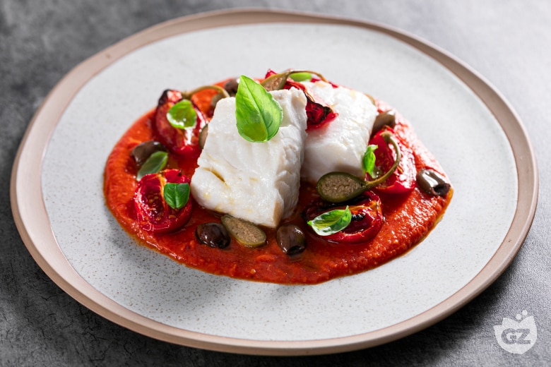 Plate the tomato purée first, then add two pieces of cod per serving. Garnish with roasted tomatoes, halved caper berries, Taggiasca olives, fresh basil leaves, and a drizzle of extra virgin olive oil.