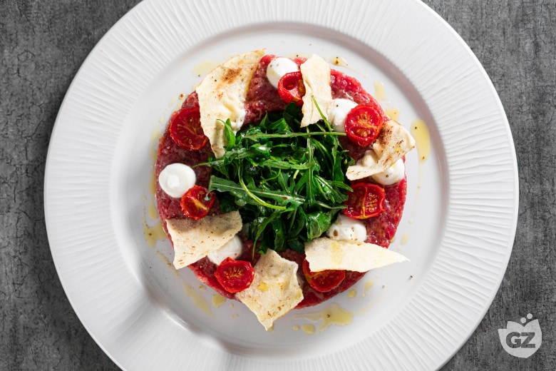 To plate: use two ring molds (one 6.3 in / 16 cm, one 3.5 in / 9 cm) to shape the tartare. Place about 4.2 oz (120 g) of beef per serving. Finish with a dollop of goat cheese, roasted cherry tomatoes, seasoned arugula, pieces of Pane Carasau, a drizzle of olive oil, and a pinch of black pepper.